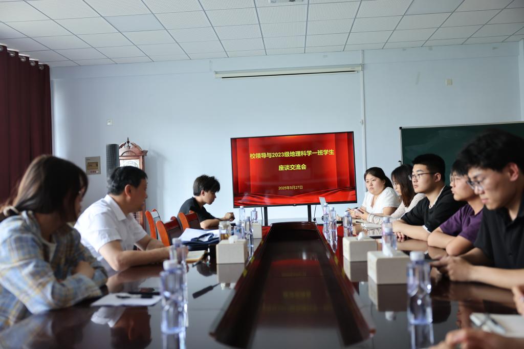 李甲亮结合地理信息技术在国土安全、生态保护等领域的应用案例,阐释国家安全与专业学习的内在联系,引导学生树立“大安全”观。课后,李甲亮副校长与学生开展座谈,围绕学校管理、专业建设、学业规划及就业前景等议题深入交流,悉心听取学生的意见建议,并就“地理科学如何服务国家战略需求”“考研就业路径选择”等问题逐一解答。