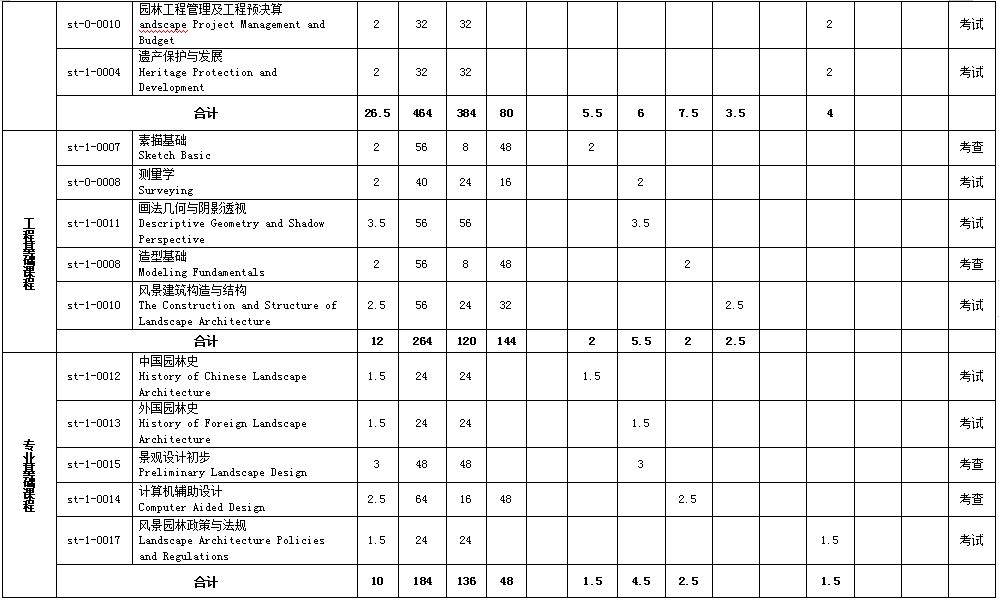 风景园林认知实习,园林树木学实习,花卉学实习,测量学实习,风景写生(素描、色彩),园林植物景观设计课程设计,风景园林工程课程设计,风景园林建筑设计课程设计,风景园林设计课程设计,北方综合实习,南方综合实习,风景区规划课程设计,城市绿地系统规划课程设计,毕业实习,毕业设计(论文)。