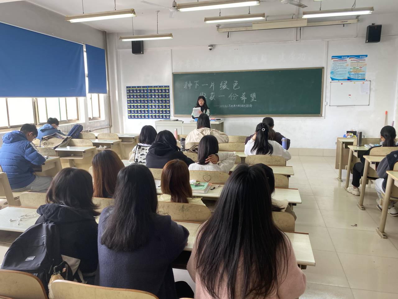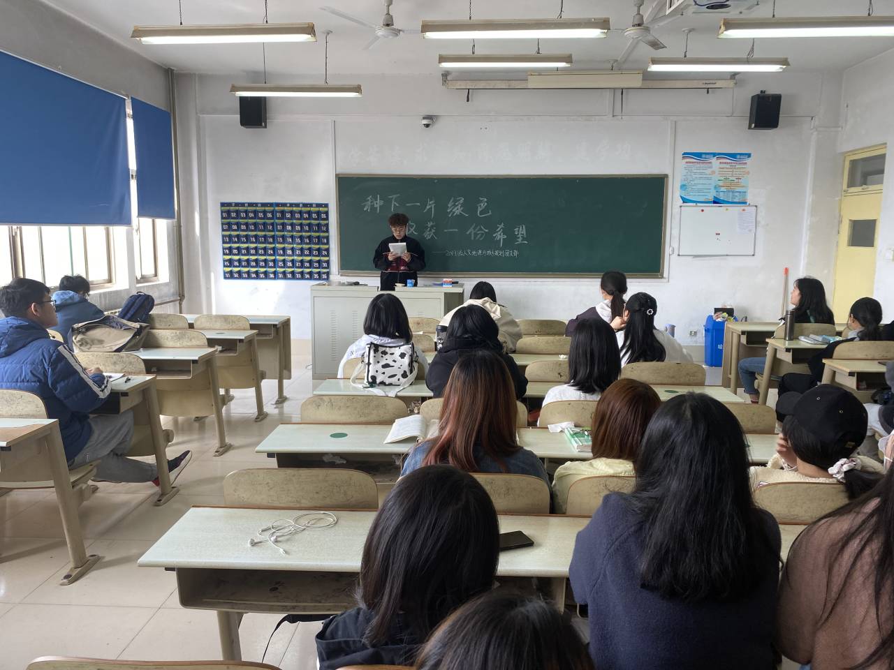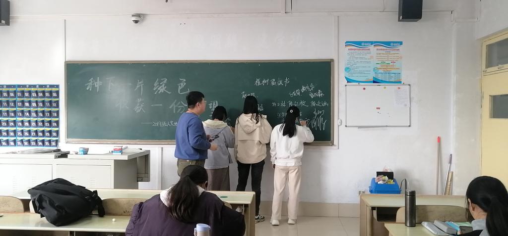 活动伊始,团支书介绍了植树节的由来和保护环境的意义:1979年2月,中国五届全国人大常委会第六次会议决定,将每年的3月12日定为中国的植树节,植树节有利于激发人们爱木、造林的感情,促进国土绿化、保护我国的林业资源,美化环境,保持生态平衡。活动过程中,班长做了关于植树节的宣传朗诵,富有感情的朗诵感染着同学们,让大家更加坚定了为保护地球生态环境出一份力的决心。活动接近尾声时,同学们在黑板上的“种下一片绿色,收获一份希望”旁写下了自己的名字,同学们踊跃参加,表示自己保护生态环境的决心与信念。