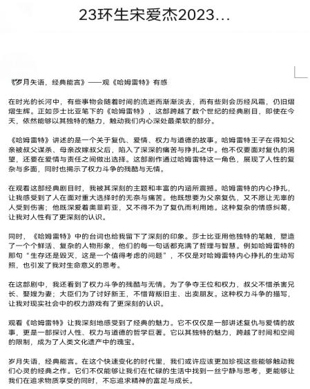 本次活动面对秋霰纶理的个人主页全体同学开展,全院同学积极响应并且热情参与。同学们纷纷沉浸于经典的海洋,以独特的视角和深刻的感悟,书写下自己与经典作品相遇相知的心路历程。他们或引经据典,或旁征博引,用生动的语言和丰富的实例,展示了经典文学作品的独特魅力和深远影响,同时,也充分展现了同学们对经典作品的深刻理解和对知识的不懈追求,让同学们领略到了传统文化的博大精深,更让他们感受到了经典文化的独特韵味和时代价值。此次“岁月失语,经典能言”品经典有感活动的成功举办,不仅为同学们提供了一个深入了解和学习经典文化的平台,更为推动中华优秀传统文化的传承和发展注入了新的活力。