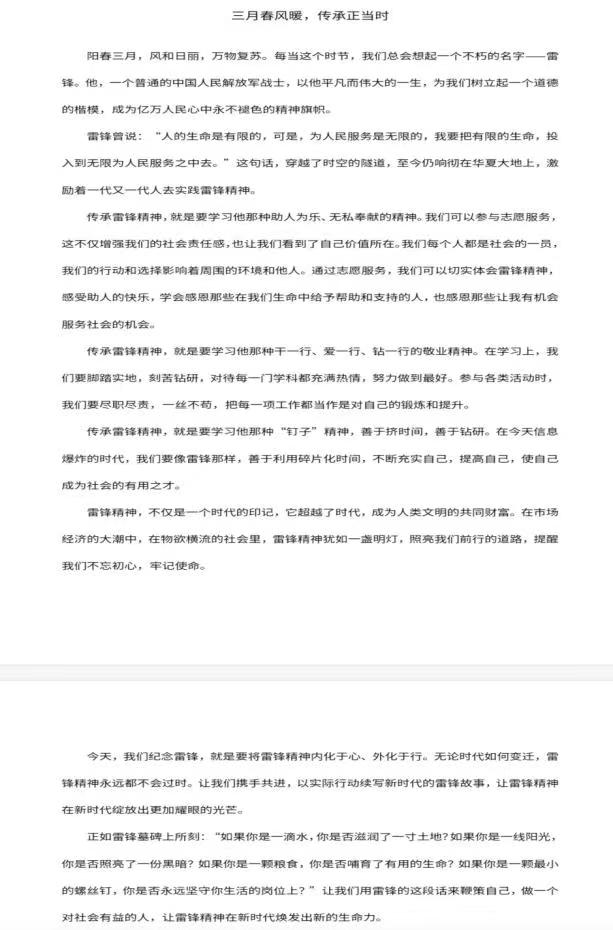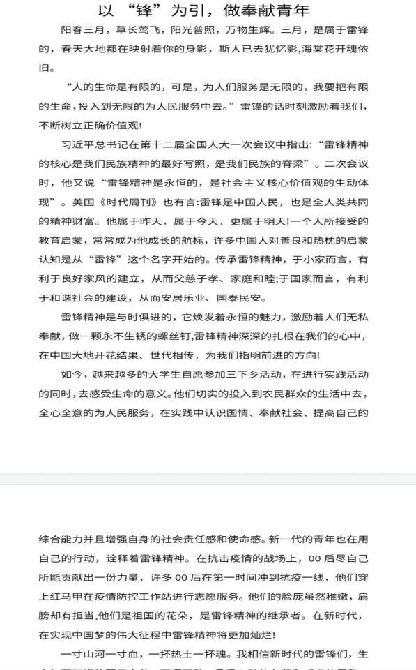 此次征文活动旨在引导并鼓励同学们识雷锋、学雷锋,成为新时代的新青年。雷锋精神不应该只成为口头上的精神,在日常生活中更应该被重视,不讲索取,勇于奉献,让世界多一些爱心。