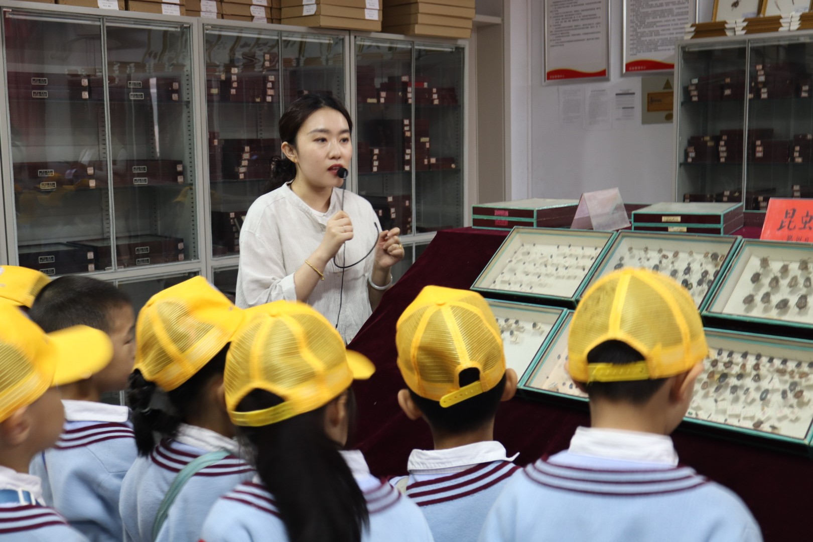 在科普基地老师的引导和讲解下,孩子们依次参观了动物标本室、岩石标本室和昆虫标本室。动物标本室内,栩栩如生的鸟类、家禽类骨骼和冻干标本引发孩子们阵阵惊叹;岩石标本室中,色彩斑斓的矿物晶体和地层剖面模型让孩子们直观感受地质变迁;昆虫标本室则通过放大镜观察蝴蝶翅膀鳞片、甲虫外壳等微观结构,激发探索兴趣。